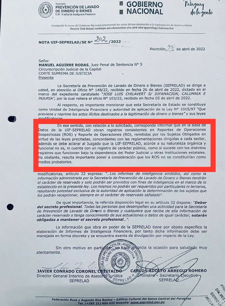 En medio de todo esto, el ex titular de la Secretaría de Prevención del Lavado de Dinero (SEPRELAD), Carlos Adolfo Arregui, en abril del 2022 confirmó al juez Manuel Aguirre Rodas, de que la institución encargada del control de lavado de dinero en Paraguay registraba dos ROS (Registro de Operaciones Sospechosas) del presidente de la CONMEBOL, Alejandro Domínguez, aunque nunca se investigó a fondo el tema.