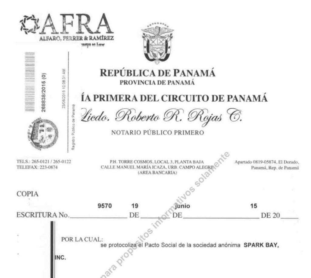 En efecto, la publicación de SPORT LIGHT señala que el 19 de junio de 2015, 45 días después de la firma de contrato con la prestanombre de FULL PLAY, Alejandro Domínguez crea la empresa «SPARK BAY» en el paraíso fiscal de Panamá.