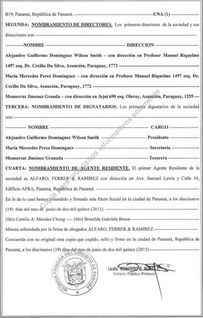 Incluso en la empresa panameña, la Directora de la CONMEBOL registra su dirección la calle Jejuy 290 esquina O’Leary, donde funciona la oficina del bufete de abogados Jiménez Balbiani & Asociados, del cual forma parte Monserrat Jiménez junto a su hermano Julio Jiménez, vicepresidente de Olimpia e íntimamente ligado a Alejandro Domínguez, dice el artículo.